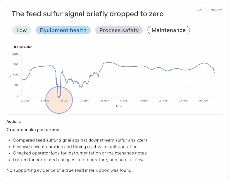 A feed drops to zero. The system knows it’s a sensor fault referenced in the operator log and deprioritizes it, saving hours of needless chasing.